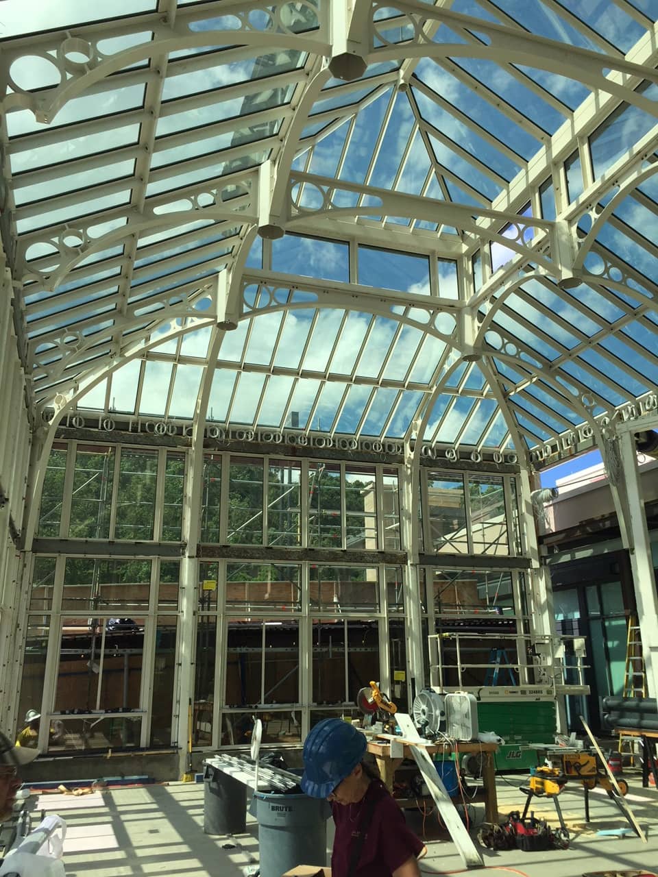 The Solarium’s structural system consists of four main, varying depth, curved steel frames containing multiple size openings that span unbraced through the clearstory. A continuous tension ring resists outward thrust at the low roof eave. Varying depth steel hip and leaner frames connect into the main frames to create the rectangular tiered open volume. Due to sequencing issues during construction, lateral loads were resolved using cantilevered wide flange steel columns fixed to the hotel foundation walls in lieu of the hotel masonry shear walls or frame action of the conservatory.