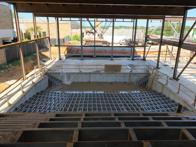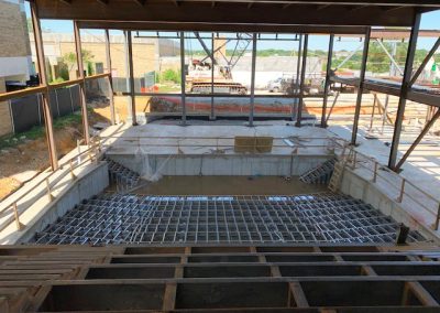 The structure is steel framed and includes unique features such as: a 79-foot clear span story truss supported by two cantilevered story trusses carrying portions of the 3rd floor, 4th floor, and roof framing, a two-story theater with elevated balcony seating, a two-story height gym with 96-foot clear span bar joists supporting a green roof, a stepped rooftop courtyard for students, interior tiered seating in the main entry lobby and gym balcony, and a cantilevered tapered colonnade canopy. The upper two floor of the classroom bar are rotated relative to the building below creating cantilevers on 3 sides of the building and numerous column transfers. EB also performed the structural design for the site landscaping, including numerous retaining walls to create the sunken football field and running track.